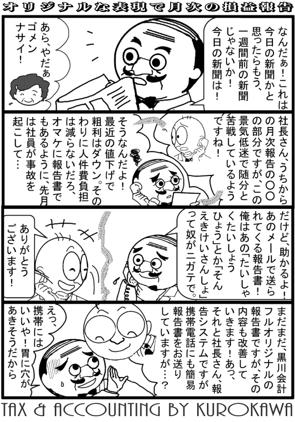 貸借対照表?損益計算書?普通の会計事務所はオフコンメーカーや他社の作成したソフトに既存をしたシステムで月次の報告をしておりますが、私たちはまったくのフルオリジナルな表現で月次のご報告をメールでお送りさせていただいてます。